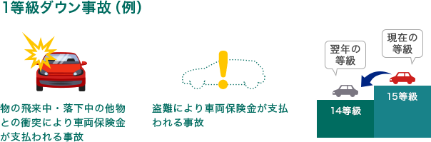 飛来中・落下中の他物との衝突、盗難や落書き、台風・洪水・高潮といった自然災害などにより車両保険金が支払われる事故が、1等級ダウン事故に該当します。
