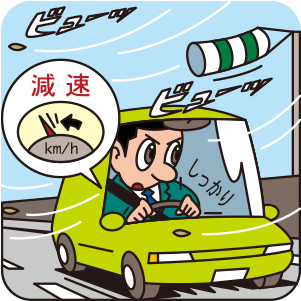 - 万一、強風に車が流されたときに、ハンドルを切り返したり急ブレーキを踏むと、かえって危険な事態を招くおそれがあります。車が流されても決してあわてずにしっかりハンドルを握って車の態勢を立て直しましょう。