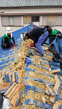 地震で被害を受けた屋根瓦の補修を行っている様子